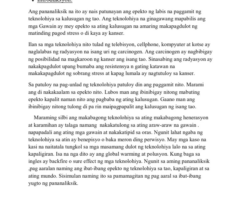 Hindi lang naman kasi sa pakikipag-chat o pakikipaghuntahan ang layunin nito kundi ang makapag-research din. EPEKTO NG TEKNOLOHIYA SA PAG-AARAL NG MGA MAG-AARAL Isang reserts report na iniharap sa mga dalubguro bilang pangangailangan para sa asignaturang Fil109 ni DONALD COGO KOLEHIYO NG SKSU KALAMANSIG SULTAN KUDARAT ENERO 10 2014 KABANATA 1 PANIMULA Tungkulin ng mga kabataan ang mag-aral kapag ang mga kabataan ay napapagud na sa. Ang social media ay hindi maikakaila na produkto ng makabagong teknolohiya ang social media ay nagkaroon ng epekto sa paghubog sa ugali at kaisipan ng bawat tao.