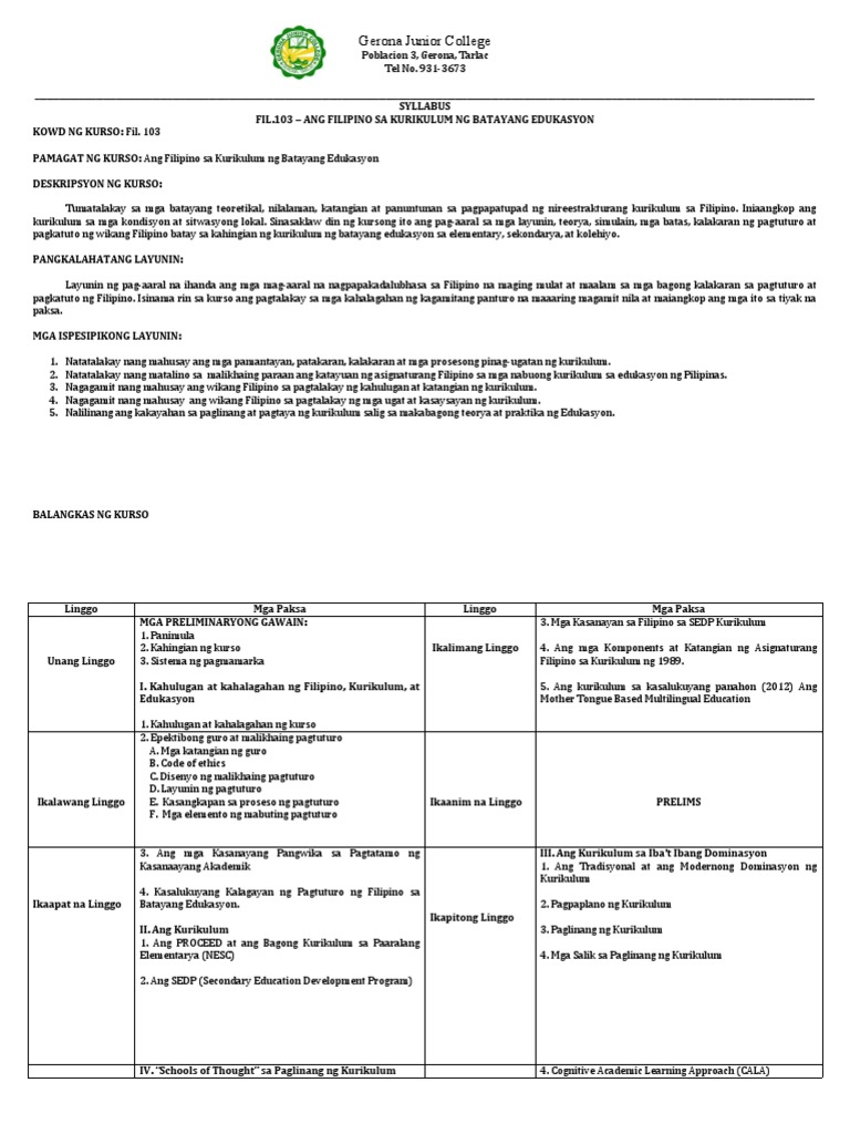 Syllabus Ang Kurikulum Ng Filipino Sa Batayang Antas Ng Edukasyon