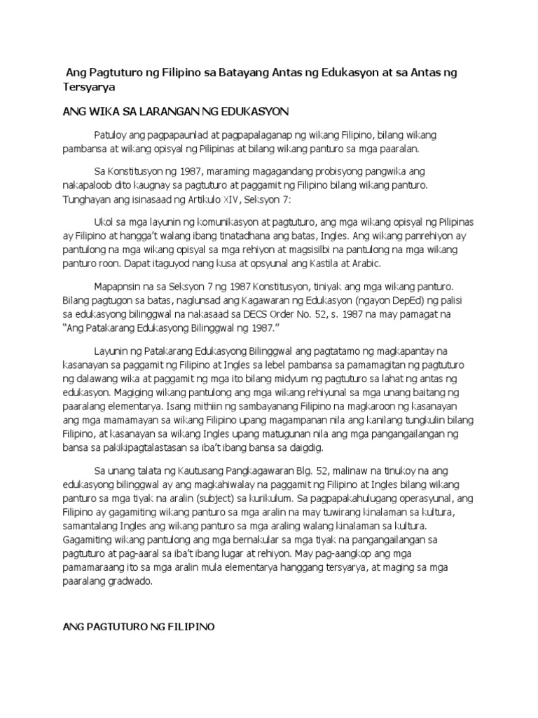Ang Pagtuturo Ng Filipino Sa Batayang Edukasyon