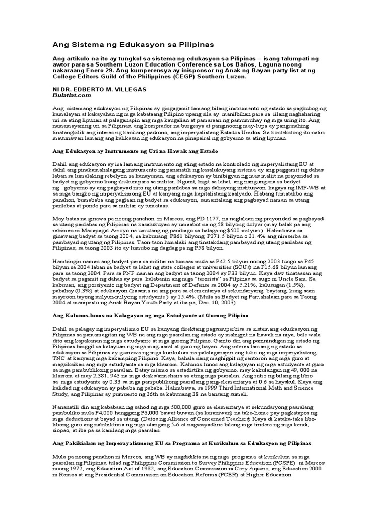 Artikulo tungkol sa sistema ng edukasyon sa pilipinas. Sa kabila nito layunin ng naturang memorandum na tugunan ang murang lakas-paggawa at kakayahang mag-Ingles para sa mga kompanya ng dayuhang mga monopolyo-kapitalista. 22102008 Edukasyon sa Pilipinas noong panahon ng mga Amerikano. Ang kasalukuyang umiiral na sistema ng pormal na edukasyon sa Pilipinas ay ang Kto12 Program at pagkatapos ay ang pagkuha ng kurso sa kolehiyo.