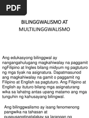 18082020 Ano Ang Bilingguwalismo. 04032015 Ayon sa Merriam- Webster Inc. Pagpapahusay ng pagkatuto sa pamamagitan ng dalawang wika upang matamo ang mas mataas na uri ng edukasyon gaya ng itinakda ng Konstitusyon ng 1987.