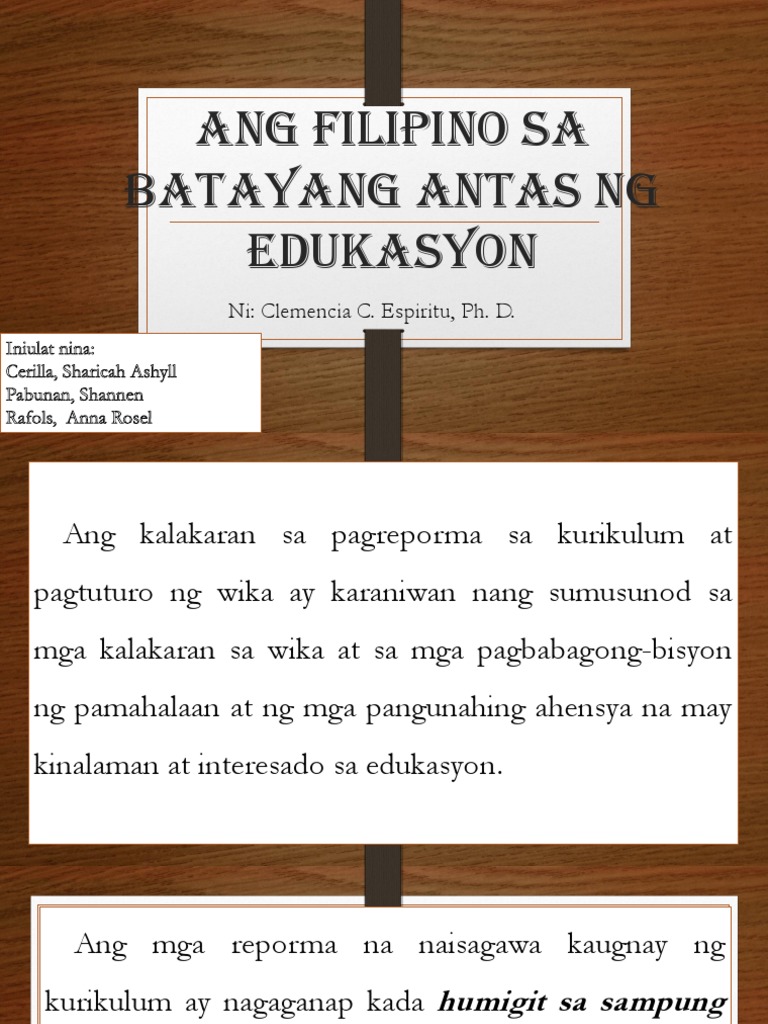 Kurikulum sa Pagtuturo ng Filipino Fil103. Mga lawak o kasanayan Lumilinang sa kasayang. Ang pagtuturo ng Filipino Gonzales 1998 - Ayon sa kanya isa sa pinakaepektibong tagapagpalaganap ng batayang kaalaman sa Filipino ay ang sistema ng paaralan.