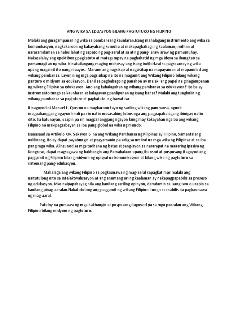Ang Wika Sa Eduasyon Bilang Pagtuturo Ng Filipino