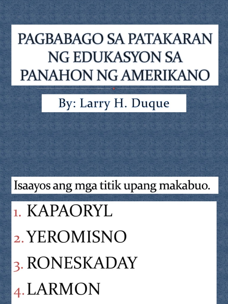 Ang sistema ng edukasyon ng mga unang Pilipino ay pormal. Edukasyon sa Pilipinas noong panahon ng mga Amerikano. Sagot PANGUNAHING LAYUNIN NG EDUKASYON Sa paksang ito ating tatalakayin kung ano nga ba ang layunin ng edukasyon.