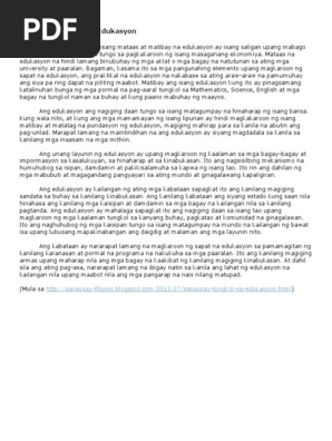 2016-02-04 Ang edukasyon ay para sa magandang kinabukasan kaya huwag tayong magsawang mag- aral ng mag-aral sapagkat hindi naman sa lahat ng panahon ay tayo ay nag- aaral. Kapag may pinag-aralan ka madali na lang para sayo na abutin at. 2019-01-04 Ang edukasyon ay hindi laging nabatay sa laman ng libro.